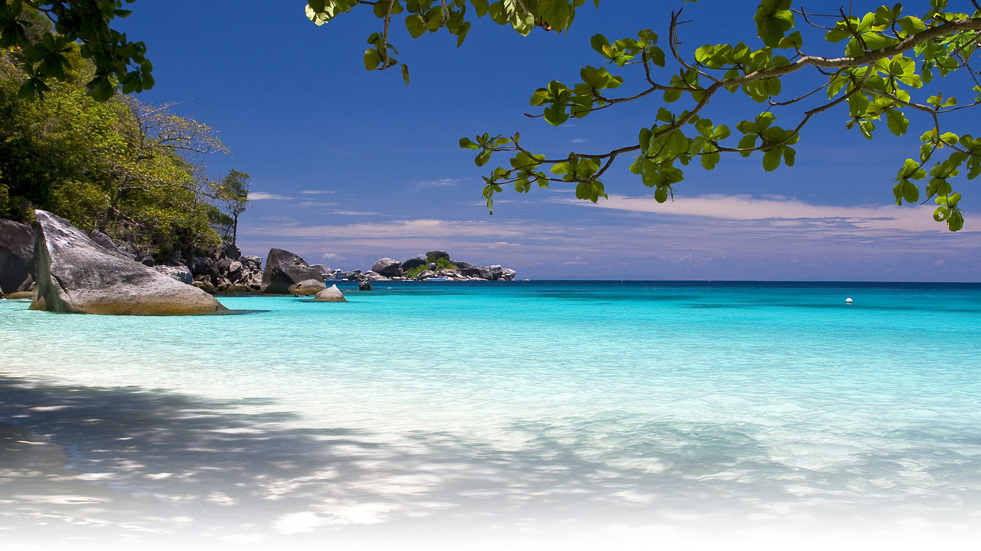 Description: A beach with a rock formation and clear blue water with rocks in the water and a tree in the foreground.