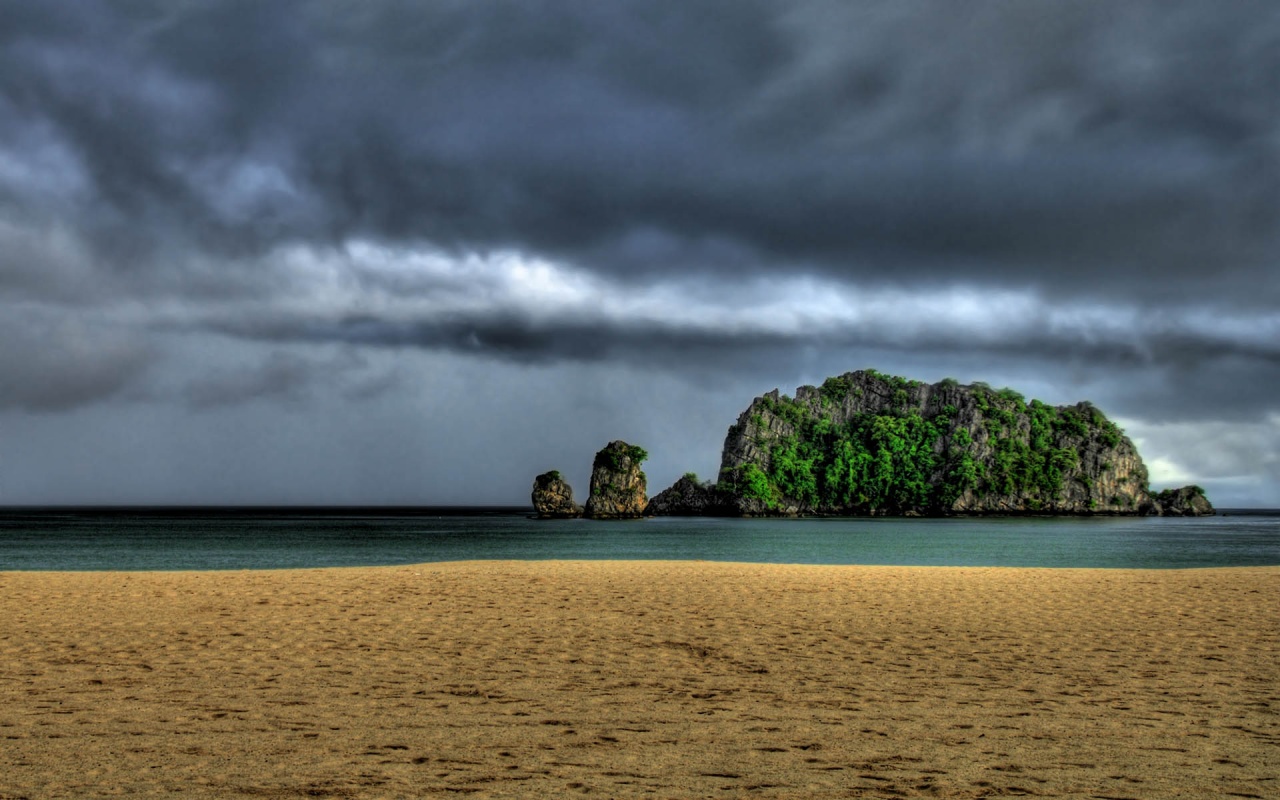 Description: A beach with a rock formation in the middle of it and a cloudy sky above it and a body of water.