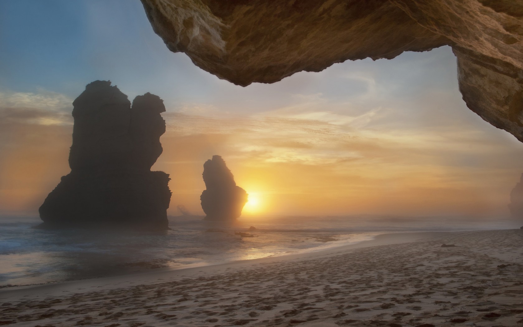 Description: A beach with a rock formation and a sunset in the background with a person walking on the beach in the foreground.