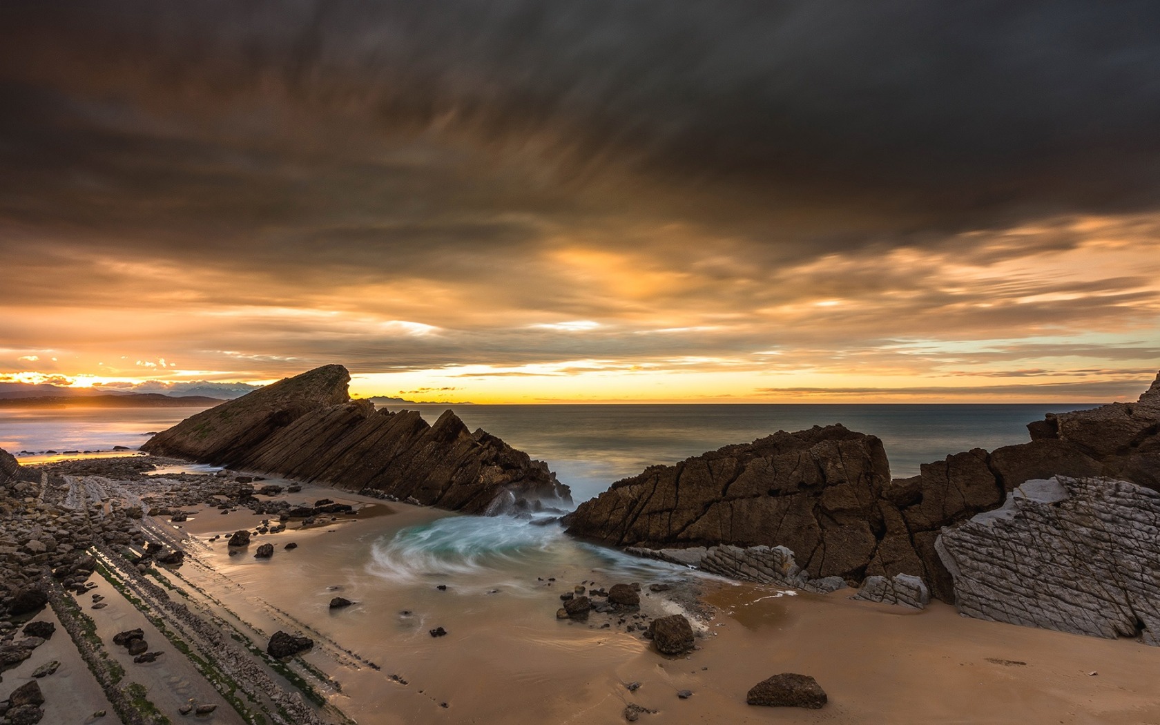 Description: A beach with a rock formation and a body of water under a cloudy sky at sunset with a few waves.