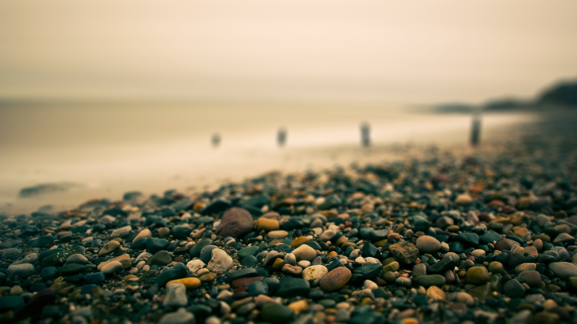 Description: A beach with rocks and gravel on it and a body of water in the background with a few people walking on the beach.