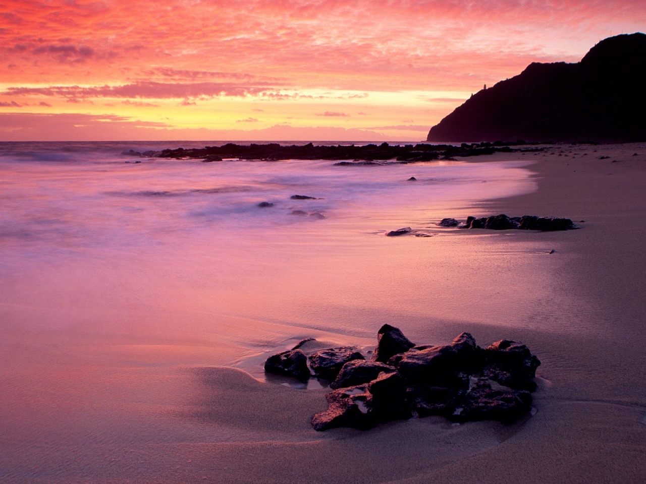 Description: A beach with rocks and water at sunset with a mountain in the background and a pink sky with clouds.