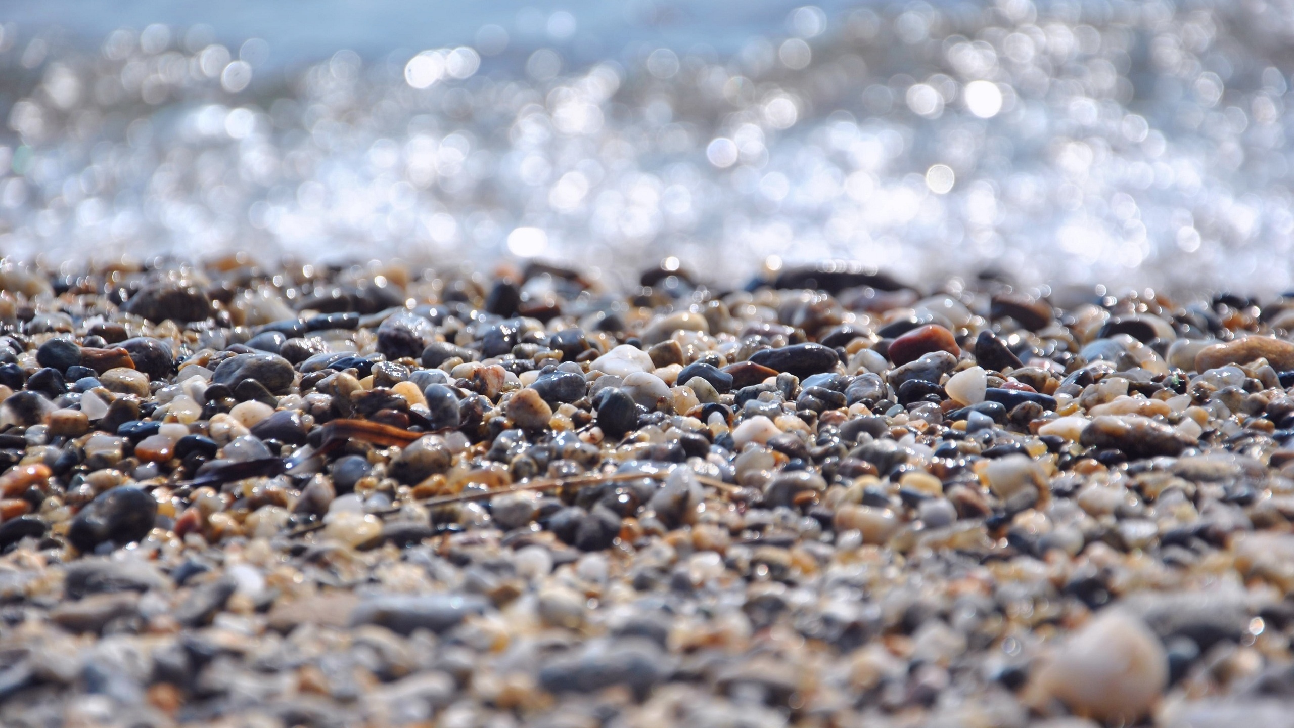 Description: A close up of a beach with rocks and water in the background and a blurry background of the sand.
