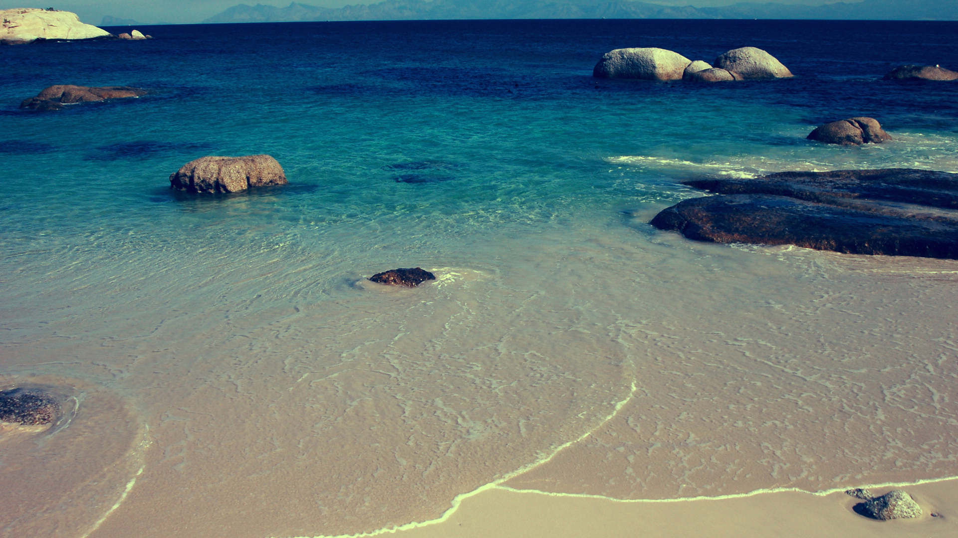 Description: A beach with rocks and water and a sky background with clouds and a few waves coming in from the water.