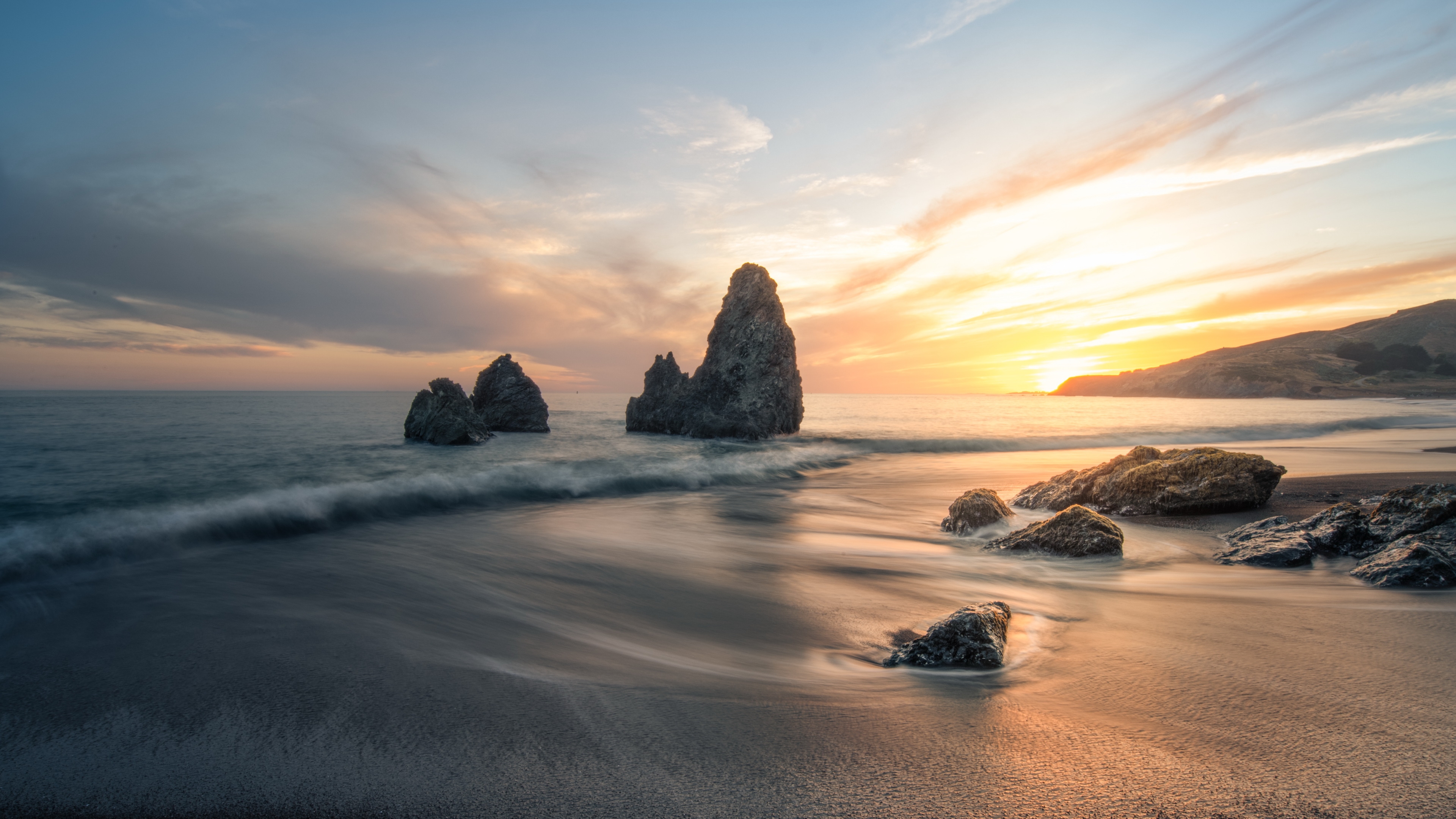 Description: A beach with rocks and water at sunset with a sky background and clouds in the sky above it and a body of water with waves coming up from the rocks.