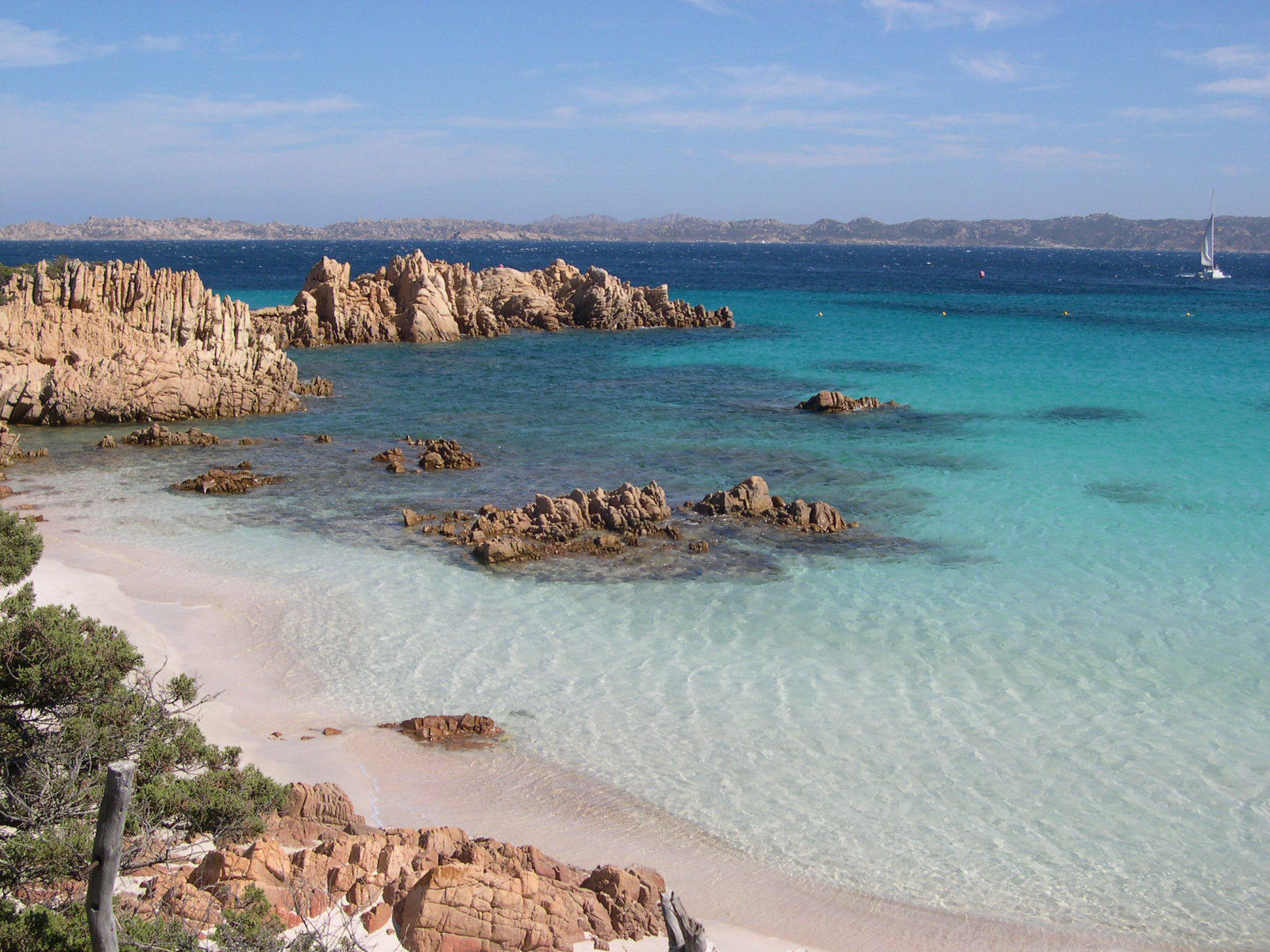 Description: A beach with a sailboat in the water and rocks in the water and a sandy shore with a few rocks.