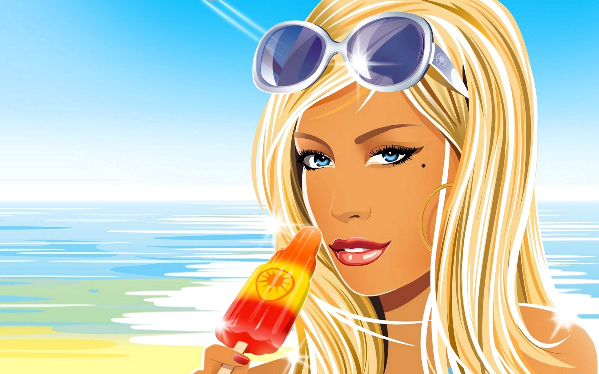 Description: A woman with sunglasses holding a drink on the beach with a sunburnt on her face and a starfish in her hand.