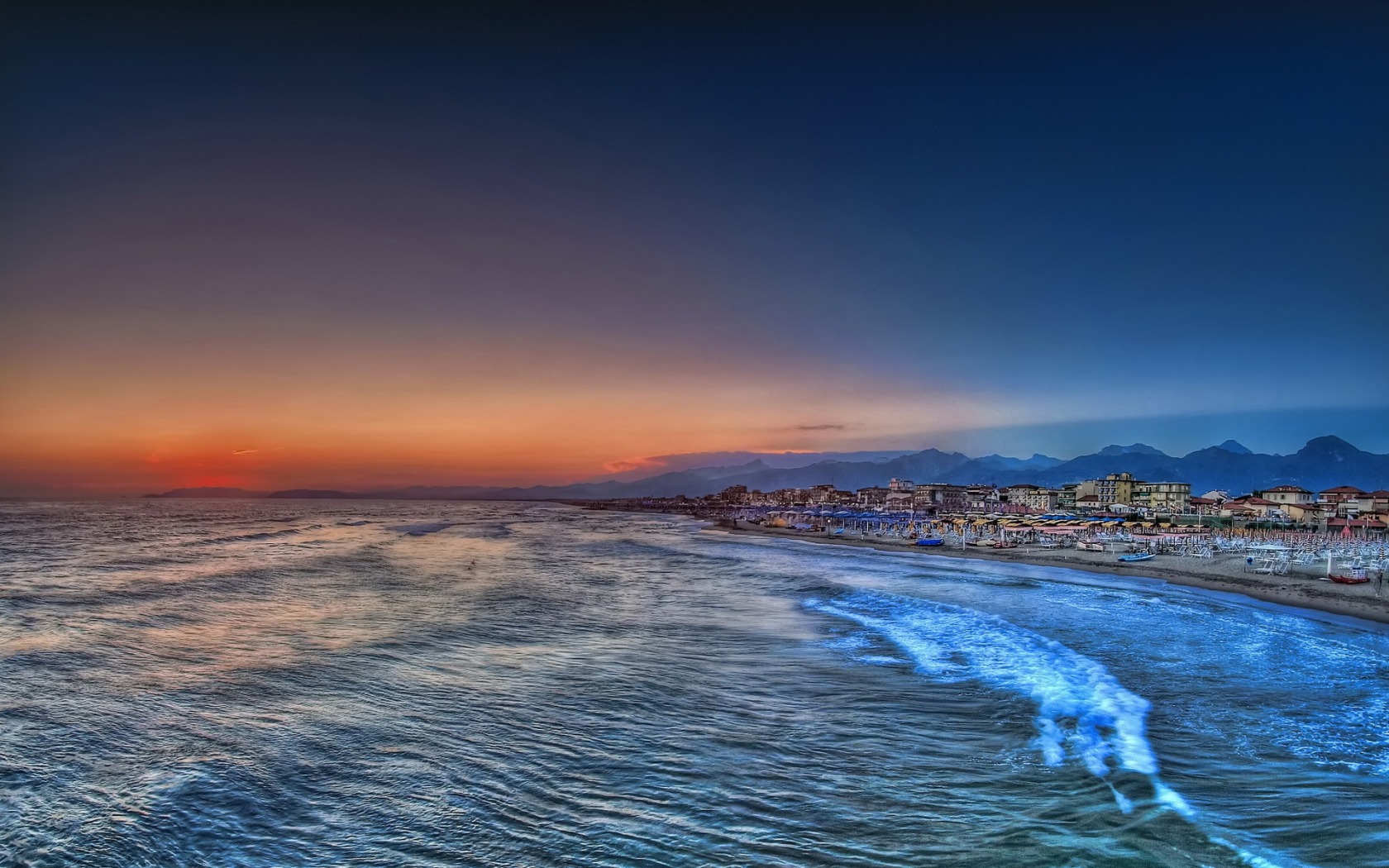 Description: A beach with a sunset and a city in the background with waves crashing on the shore and a few buildings on the shore.
