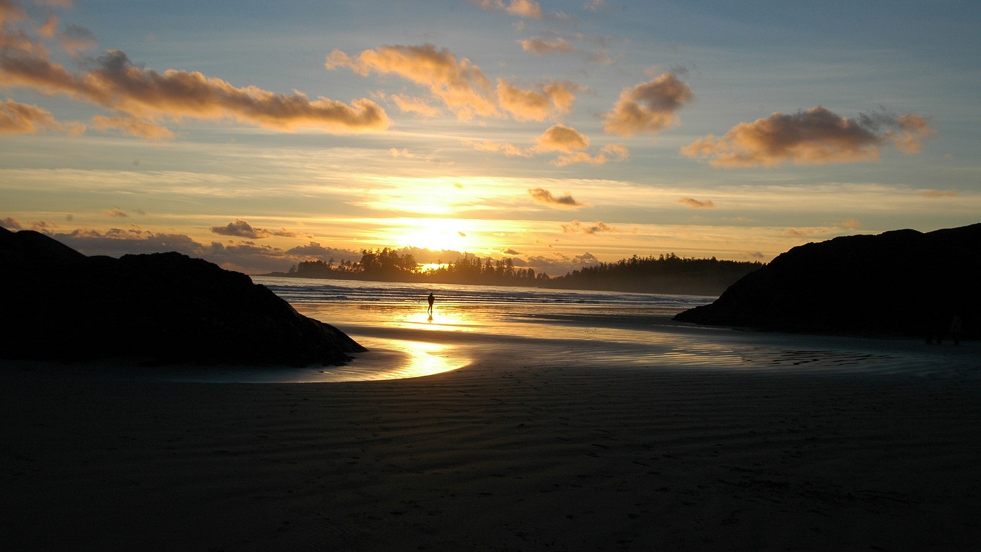 Description: A person walking on a beach at sunset with the sun setting in the background and clouds in the sky.