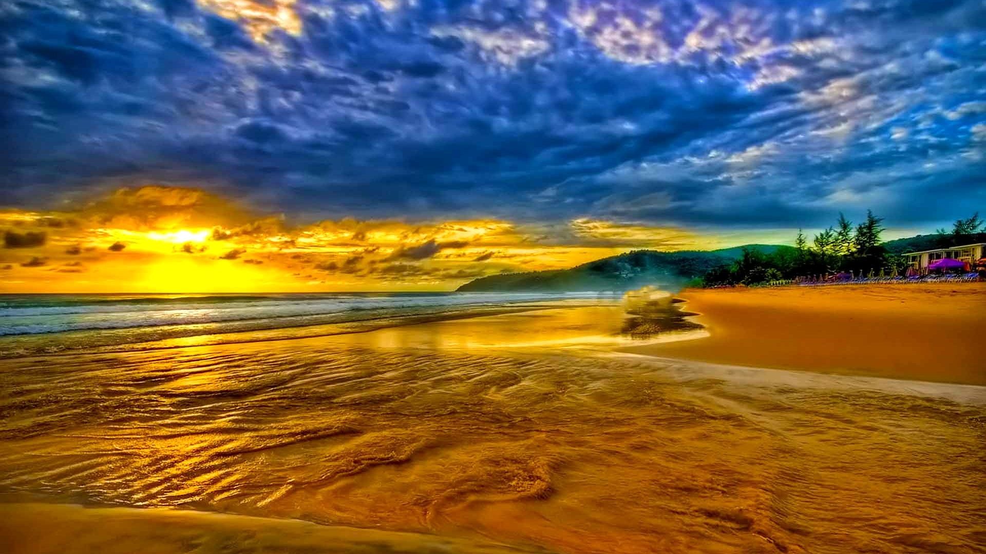 Description: A beach with a sunset and clouds in the sky above it and a house on the beach in the distance.