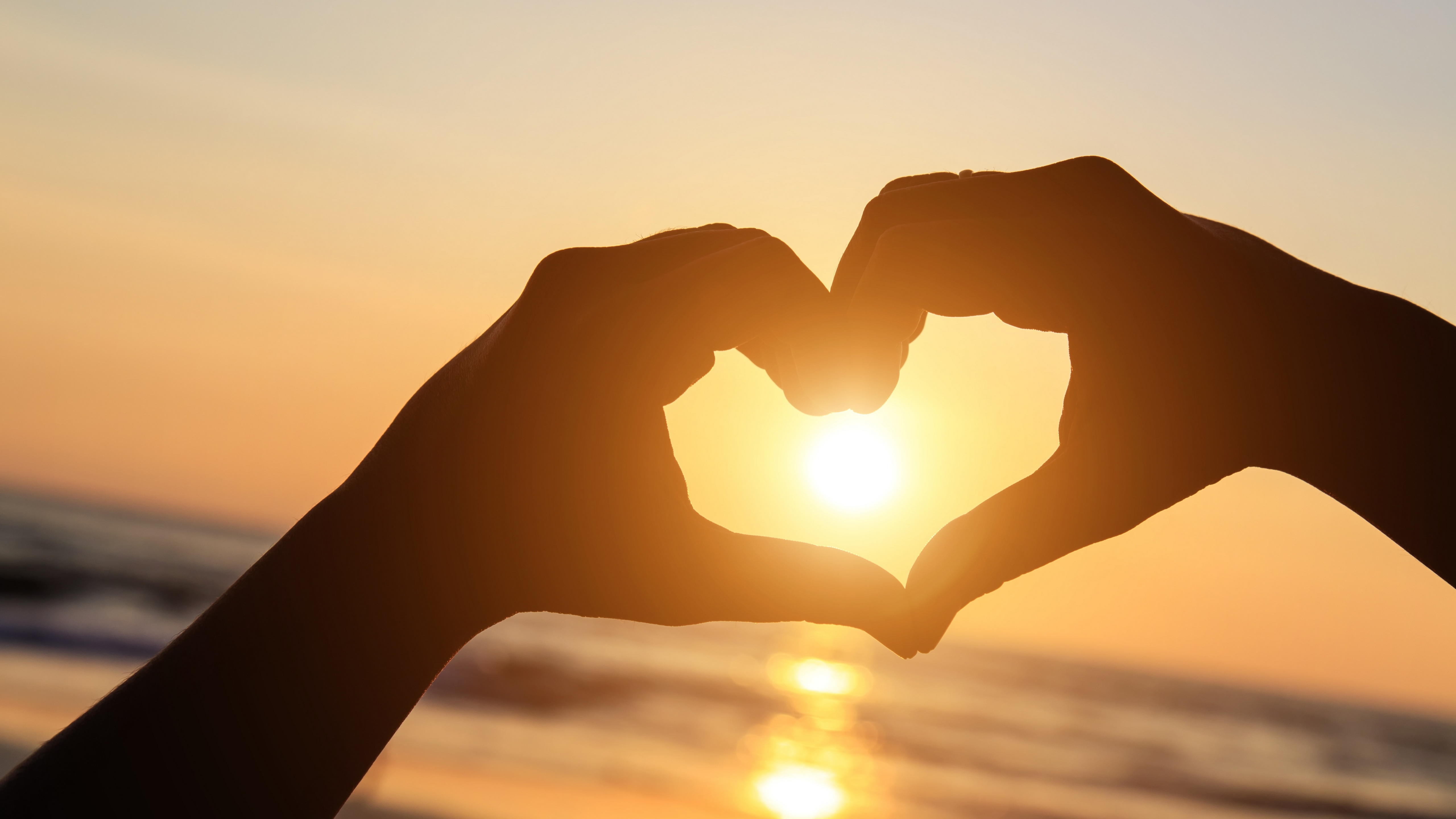 Description: A person making a heart shape with their hands at the beach at sunset or sunrise time with the sun in the background.