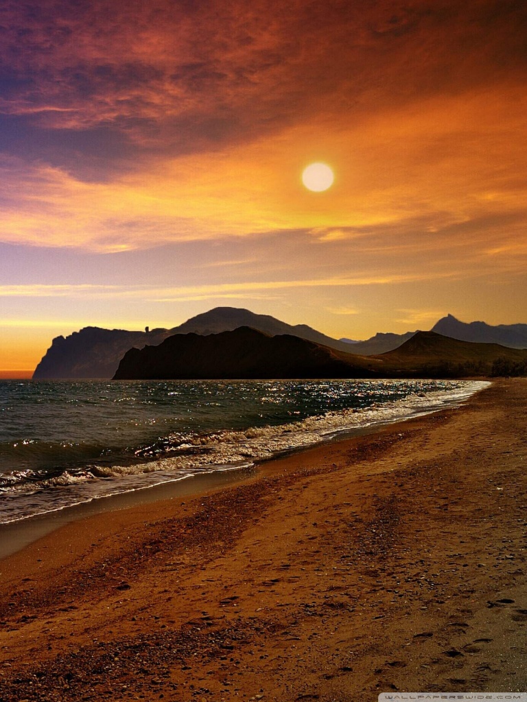 Description: A beach with a sunset and a mountain in the background with a person walking on the beach in the foreground.