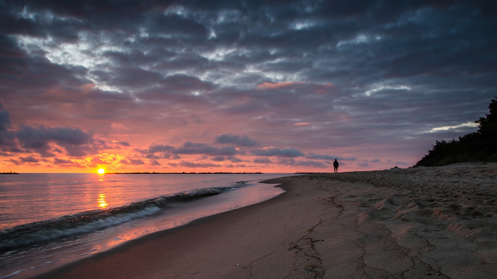 Description: A person standing on a beach at sunset with the sun setting in the distance behind them and the water in the foreground.