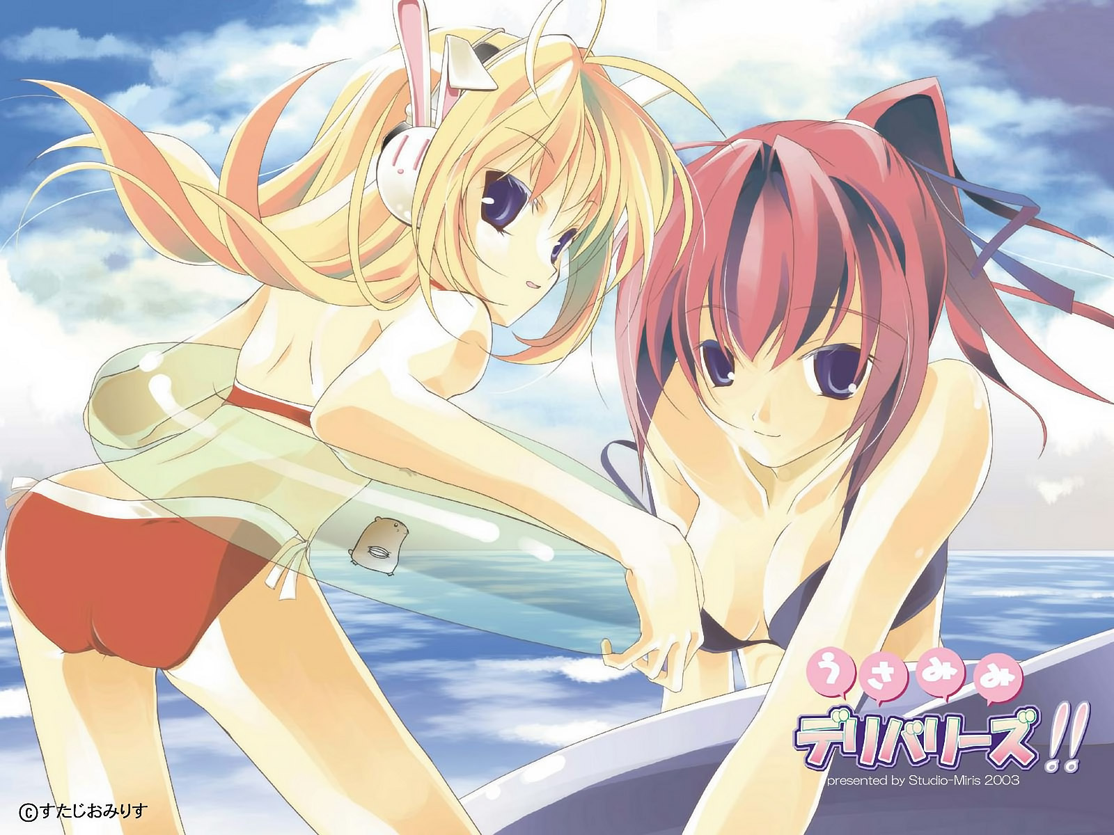 Description: Two anime girls on a beach with a surfboard in the foreground and a cloudy sky in the background.