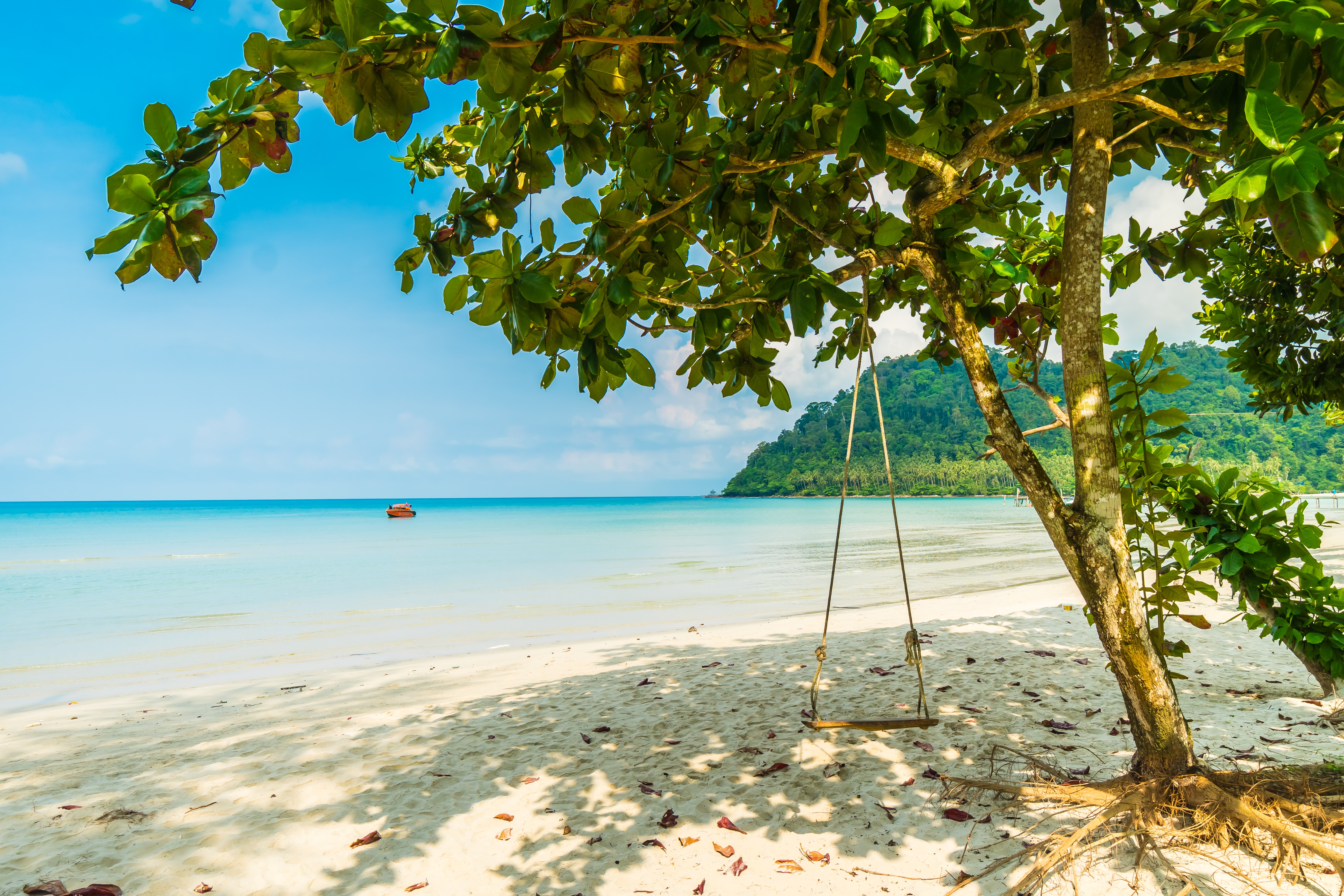 Description: A swing set on a beach with a boat in the distance and a tree in the foreground with a blue sky.