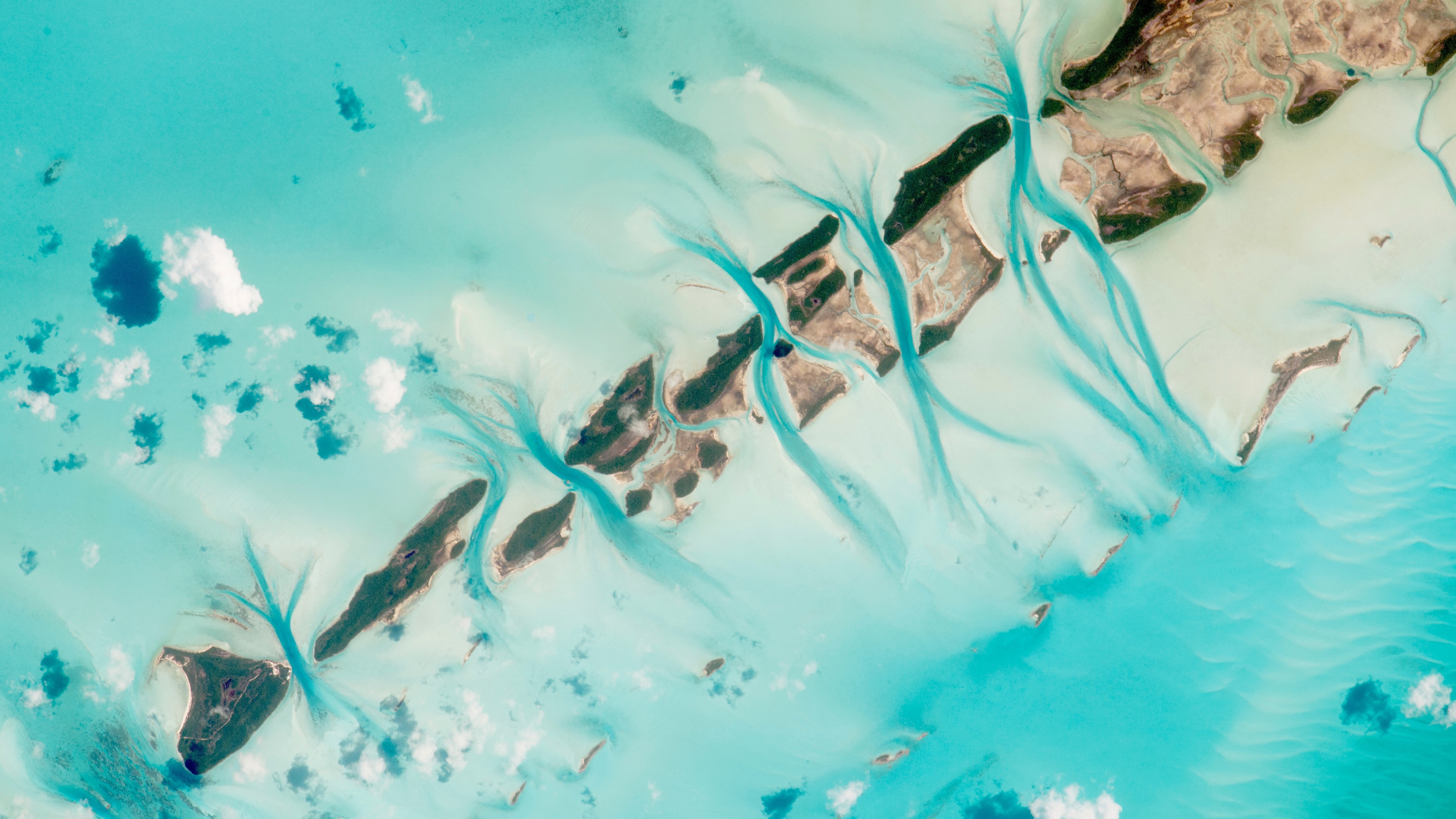 Description: A view of a beach from above with a blue ocean and sand and water around it and a sandy shore.