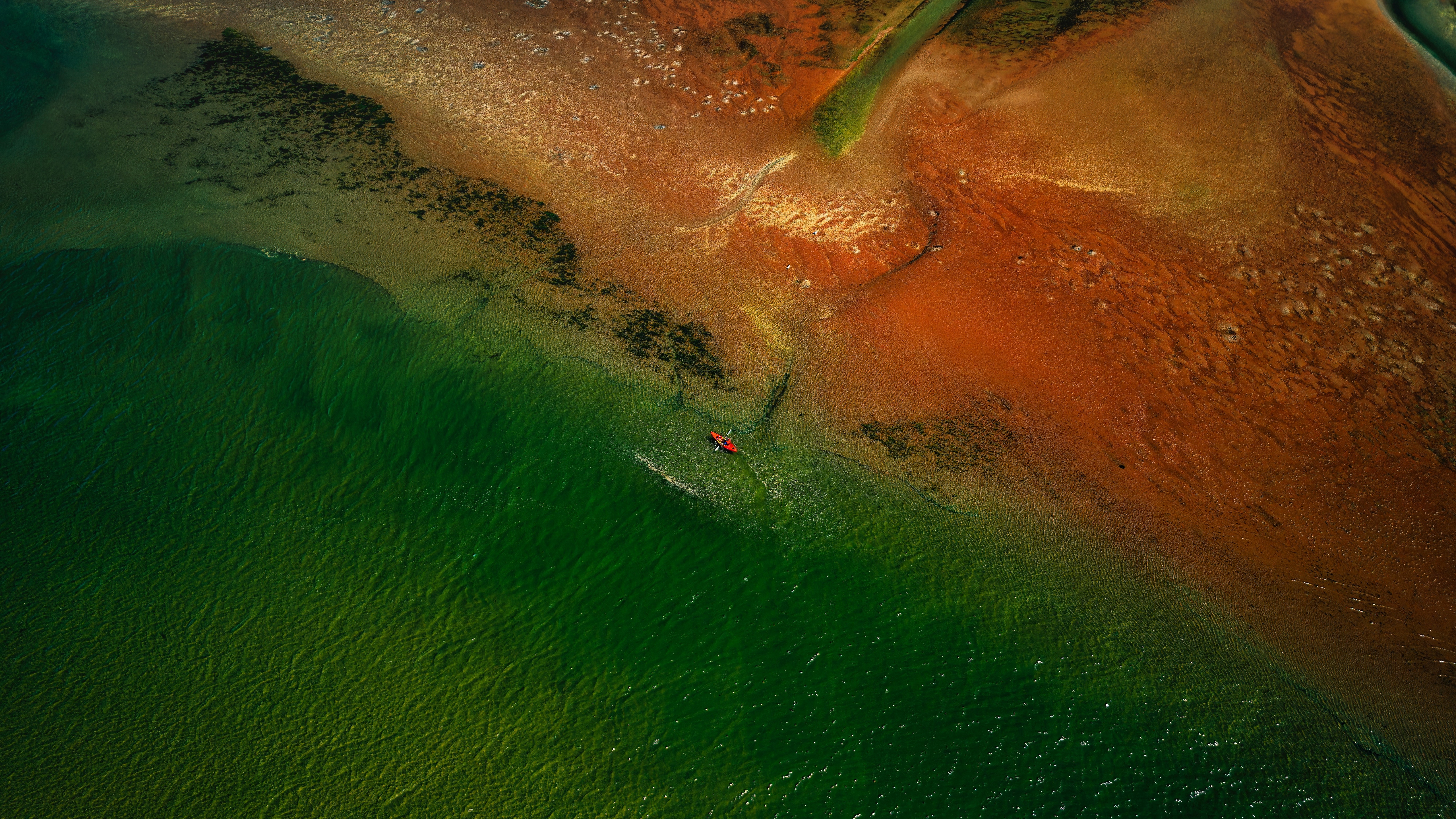 Description: A view of a beach from a plane looking down on the water and land below it and a person on a surfboard.