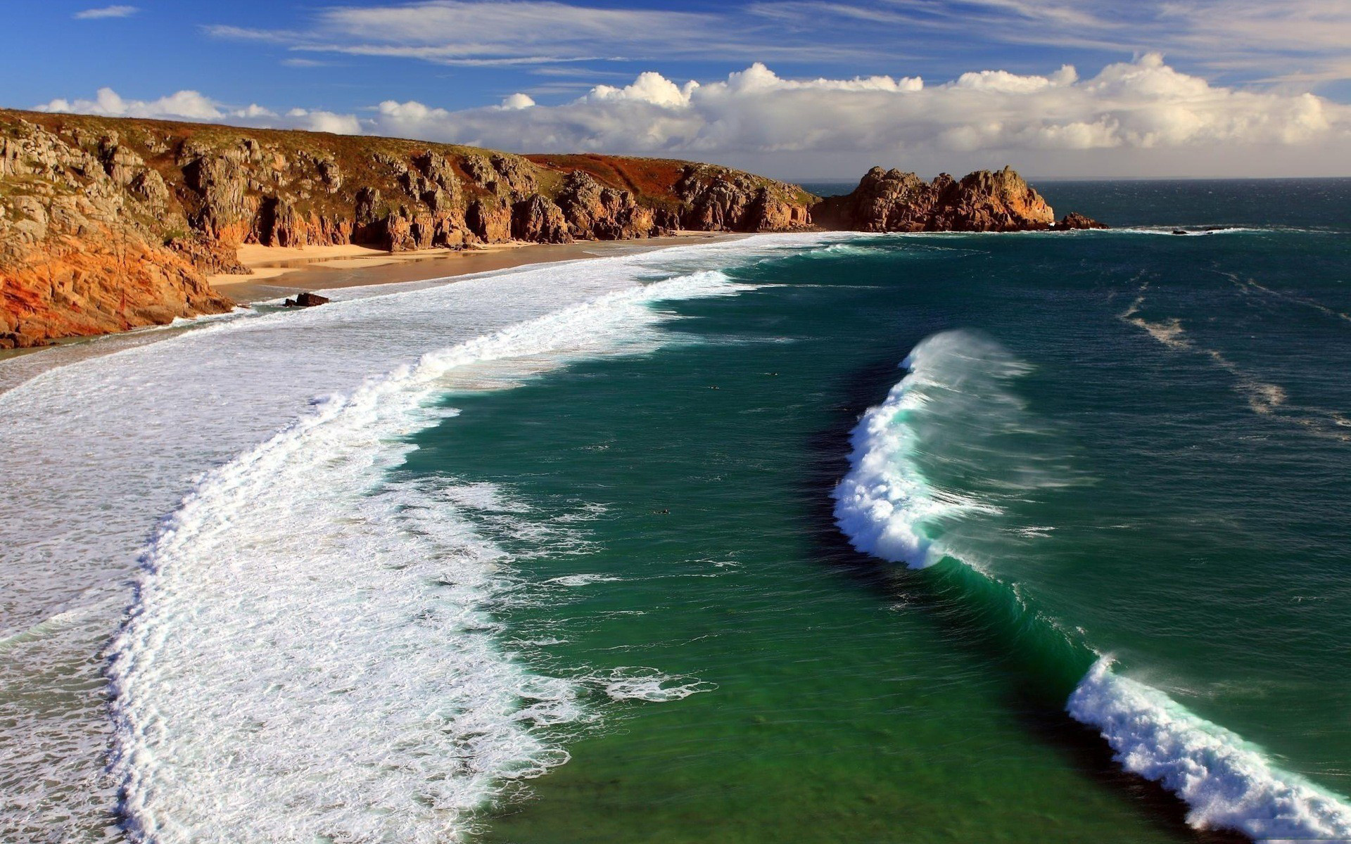 Description: A view of a beach with a wave coming in to shore and a cliff in the background with a blue sky.