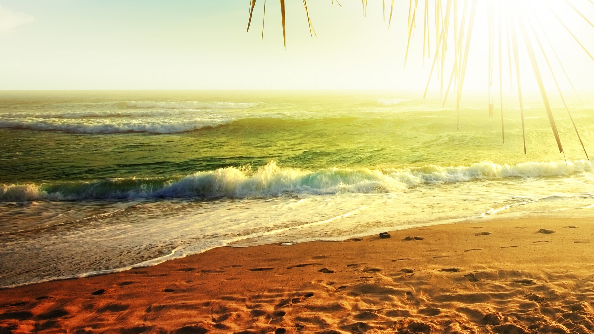 Description: A beach with waves crashing on the shore and a palm tree branch hanging over the water's edge.