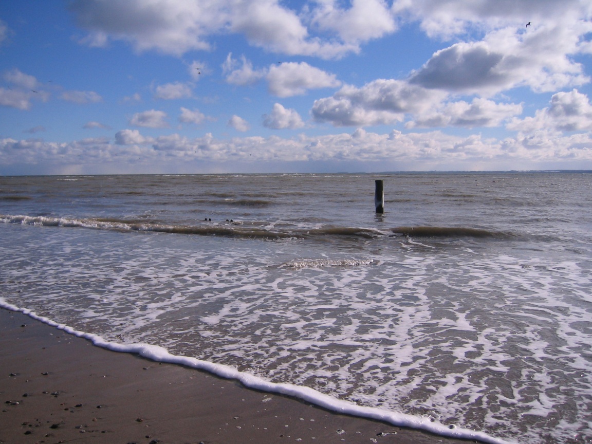 Description: A beach with waves coming in and a pole sticking out of the water in the distance with a cloudy sky.