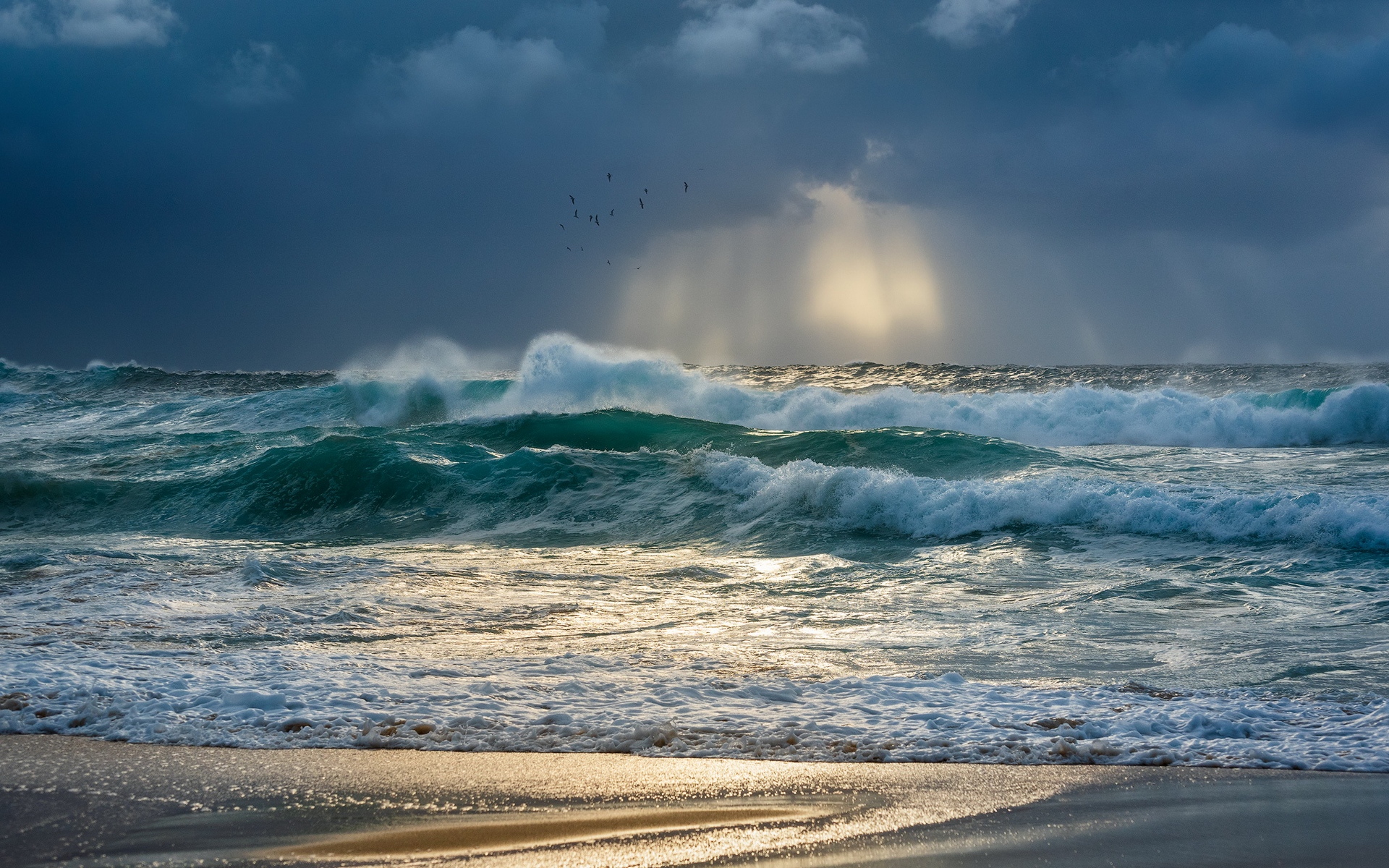Description: A beach with waves crashing on the shore and a sunbeam in the sky above it with birds flying overhead.