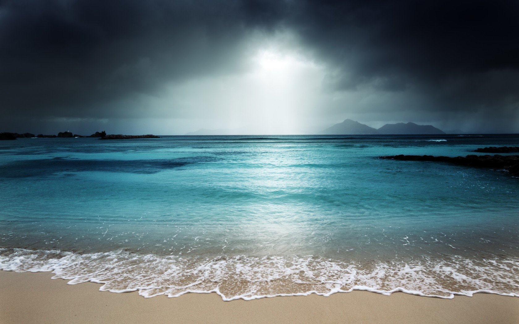 Description: A beach with waves and a sunbeam in the sky above it and a mountain in the distance with a dark sky.