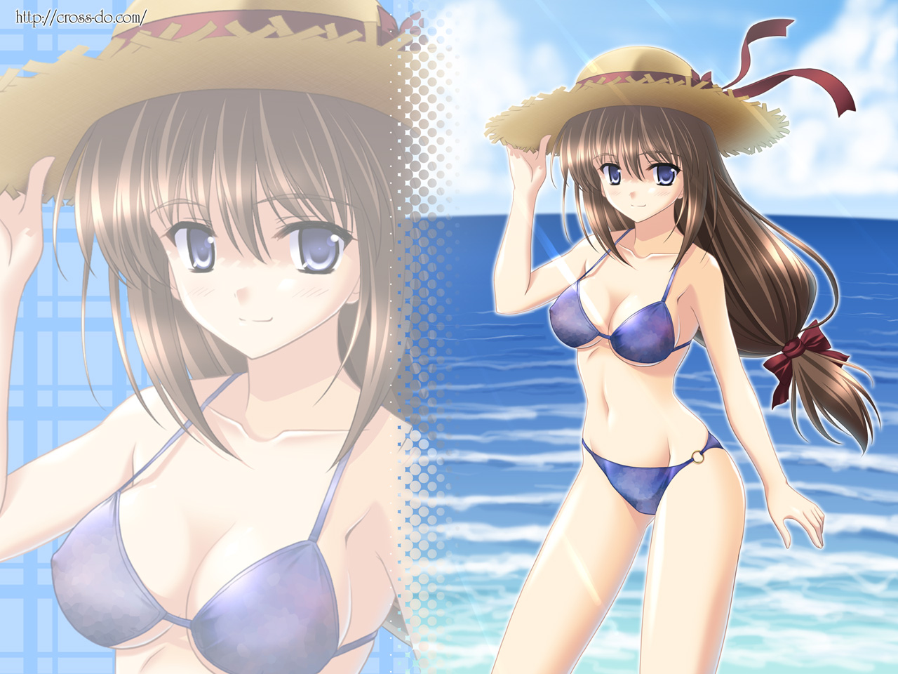Description: A woman in a bikini and a hat on the beach next to the ocean and a woman in a bikini.