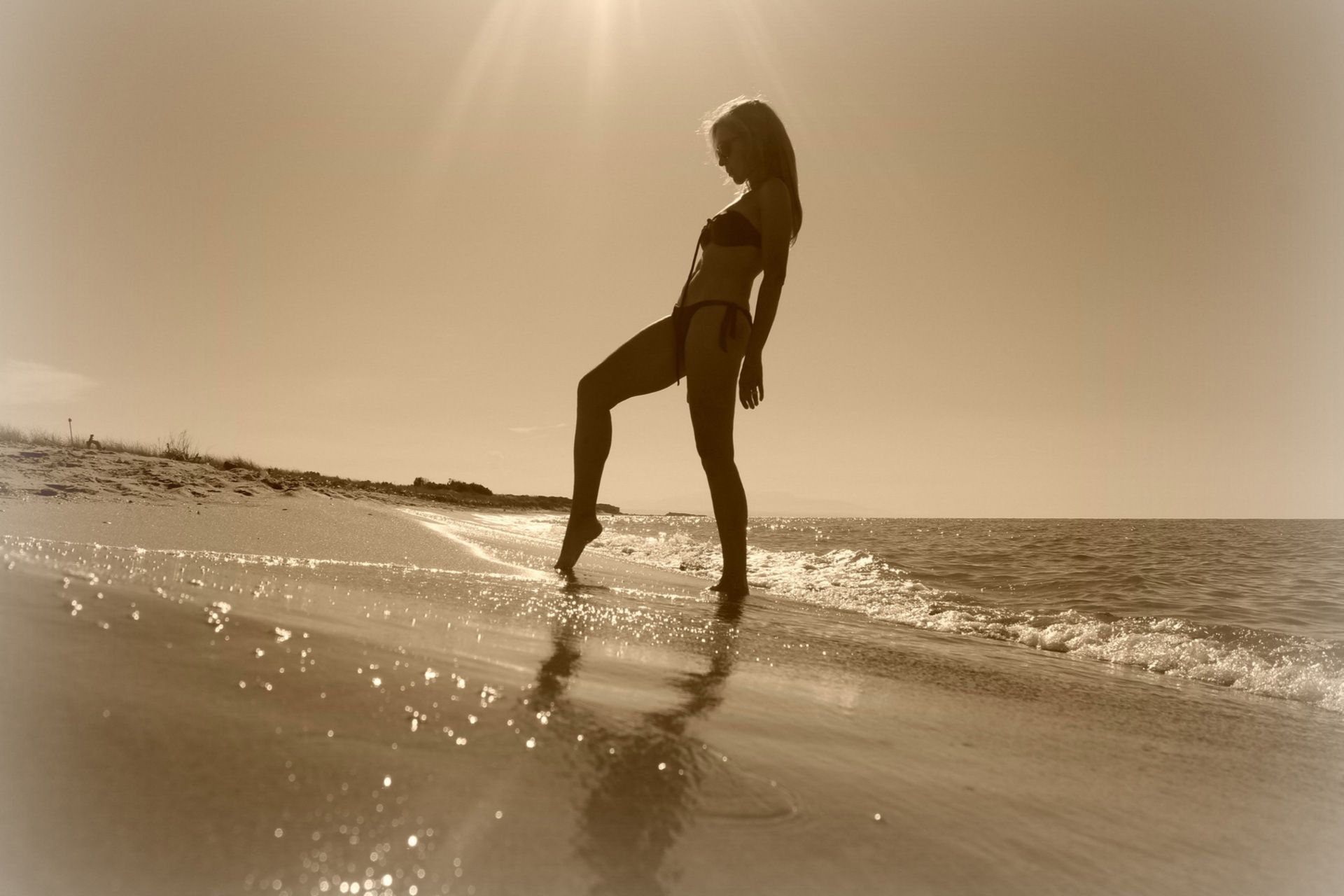 Description: A woman in a bikini standing on the beach in the sun with her legs crossed and her legs bent.