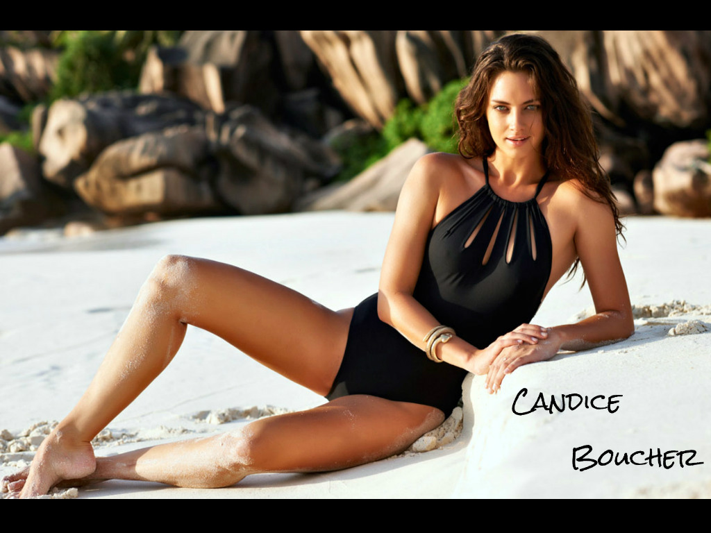 Description: A woman in a black swimsuit laying on a beach with her legs crossed and her hand on her hip.