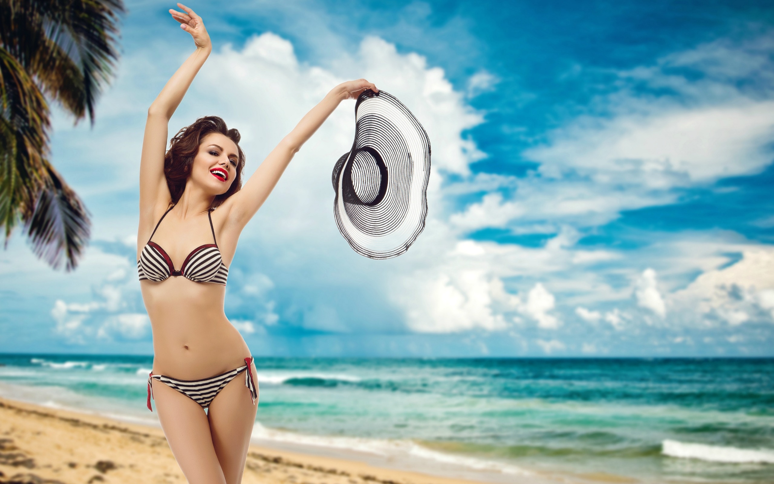 Description: A woman in a bikini and hat on a beach with a palm tree in the background and a blue sky.
