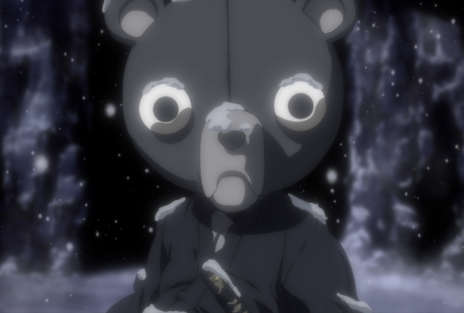 Description: A bear with a black coat and a black hat and a knife in his hand and a snowy background.