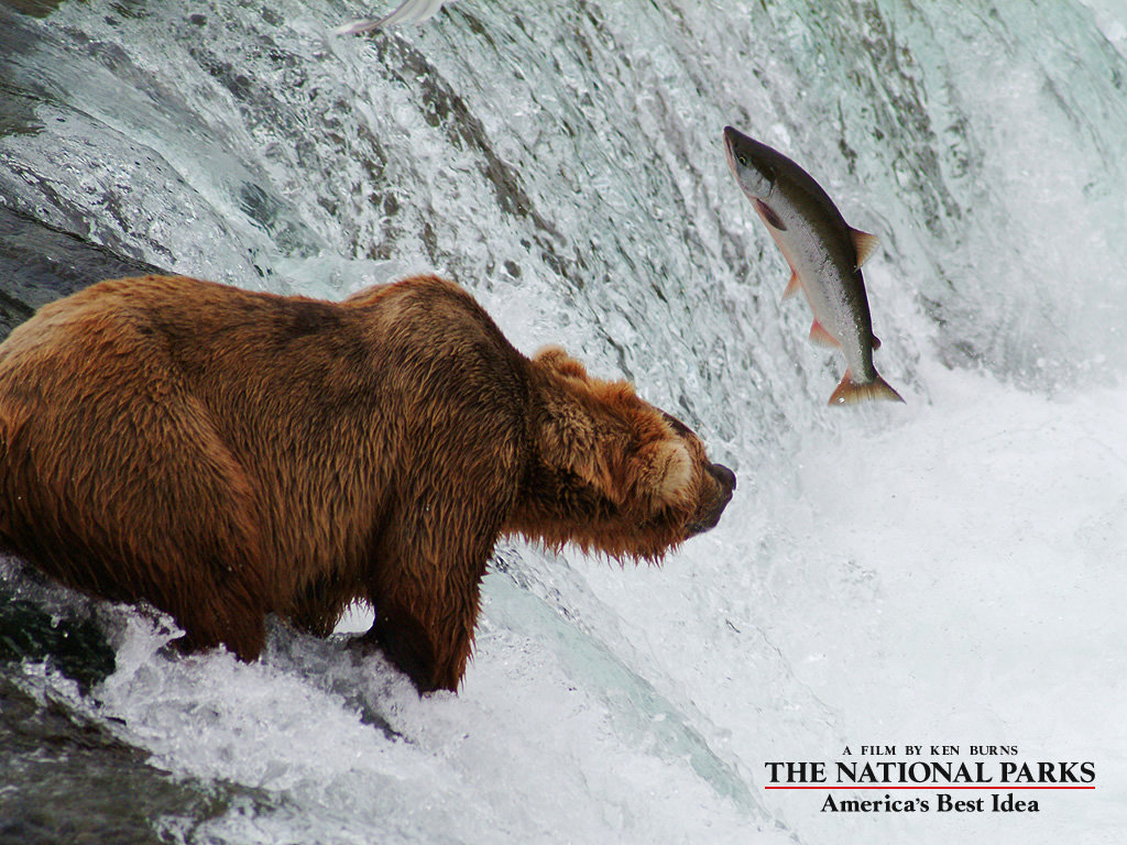 Description: A bear is standing in the water and a fish is flying above him and the water is rushing behind him.