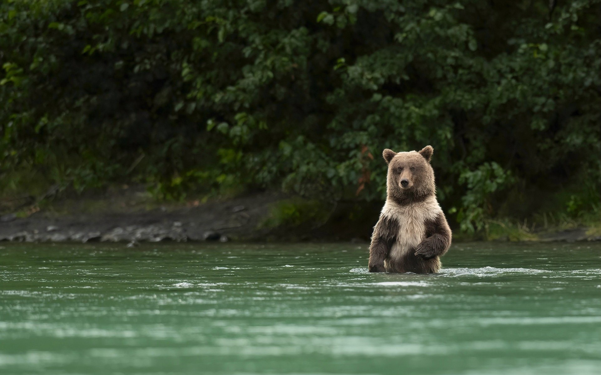 Description: A bear is standing in the water near a bank of trees and bushes in the background.