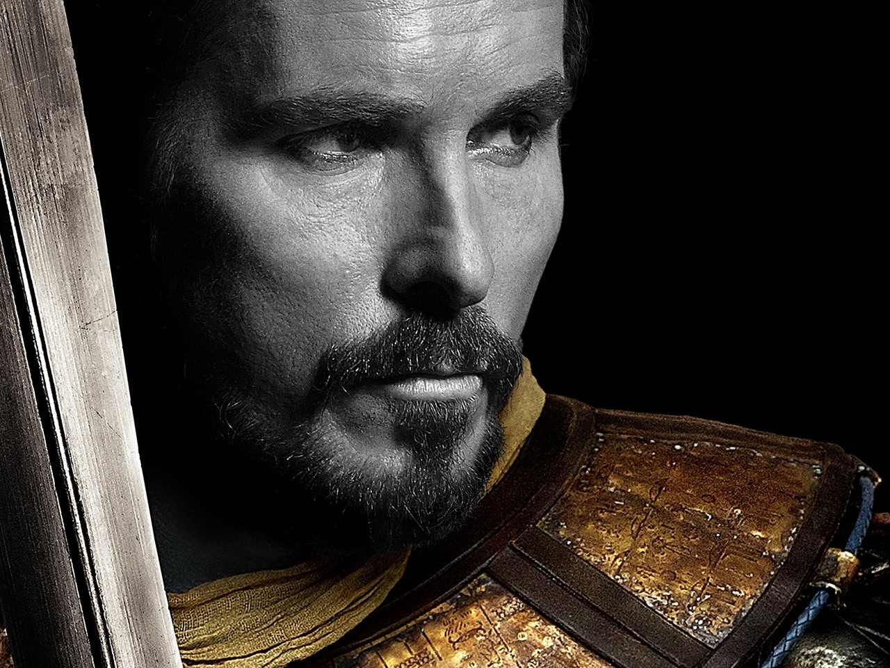 Description: A man with a beard and a beard wearing a suit of armor holding a sword in his hand and looking at the camera.