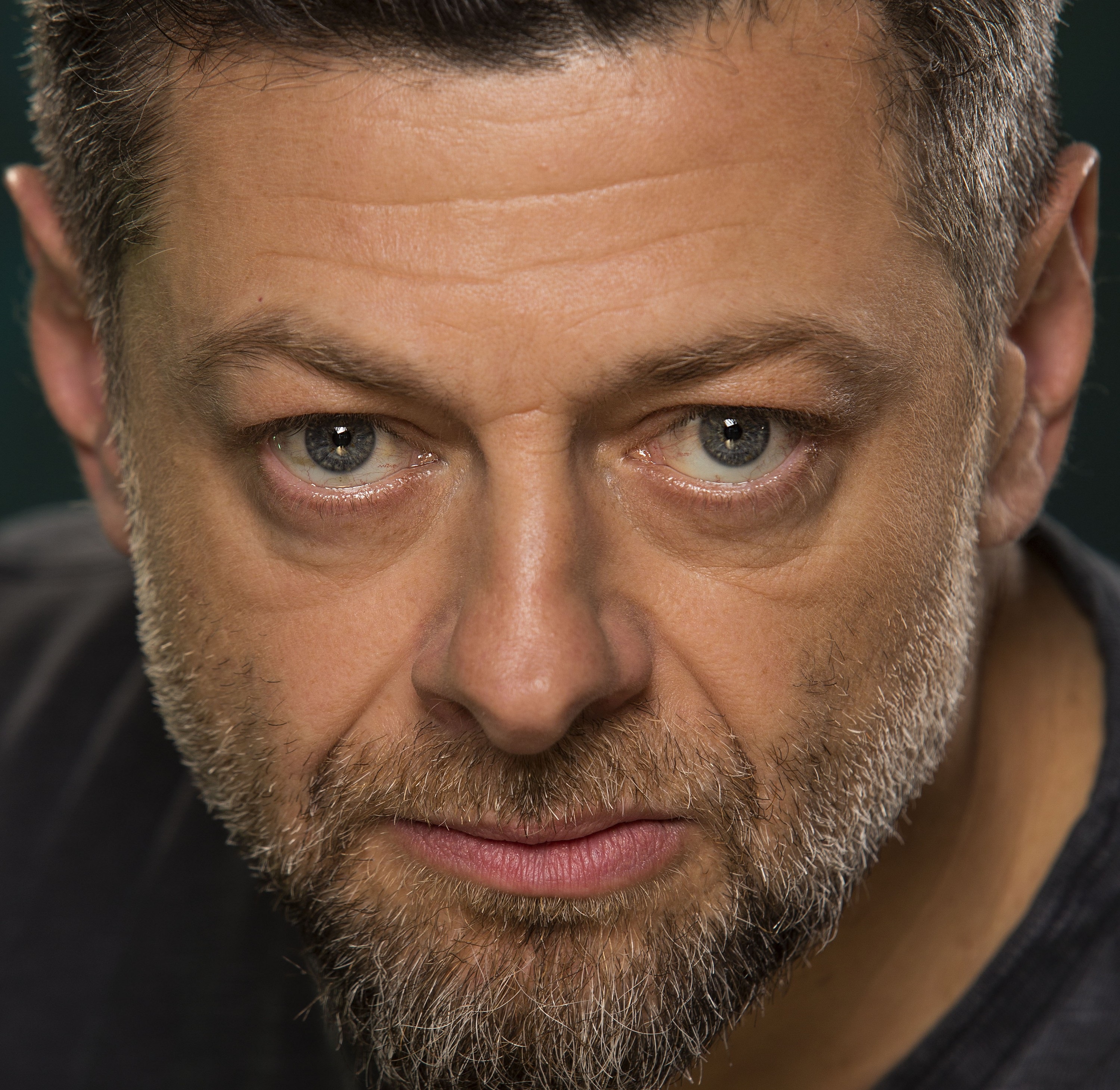 Description: A man with a beard and a black shirt looking at the camera with a serious look on his face.