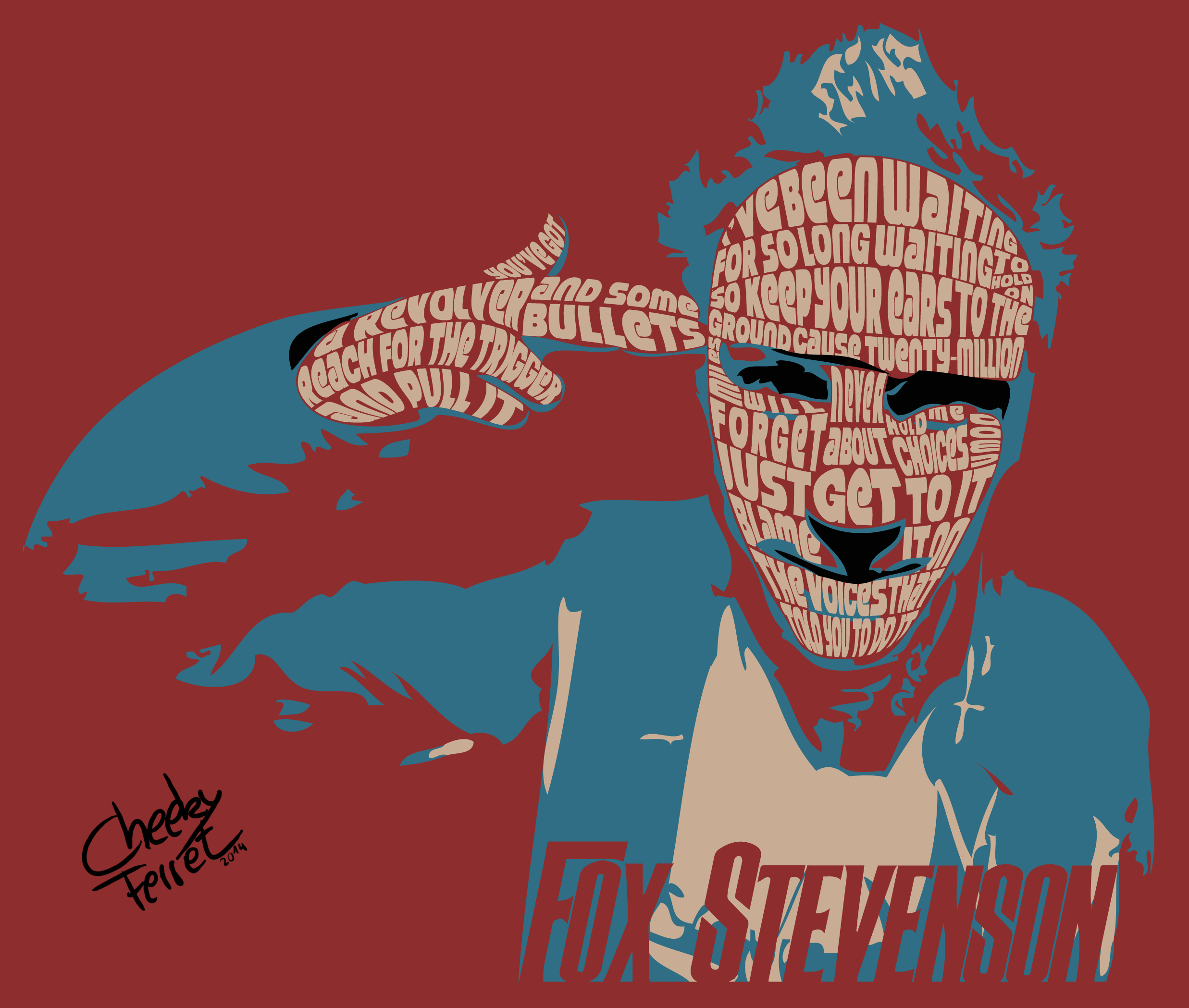 Description: A man with a beard and a blue jacket has words written all over his face and hands on his head.