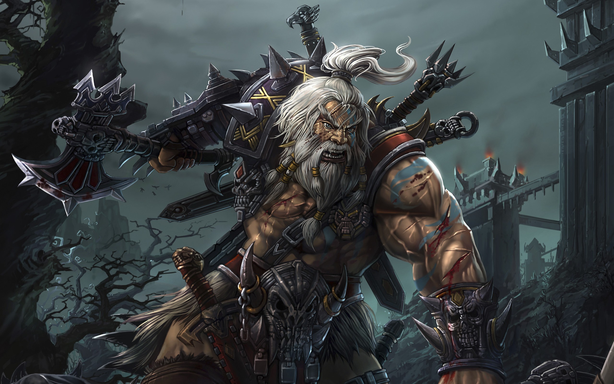 Description: A man with a beard and a beard with a sword in his hand and a demon with a sword in his hand.