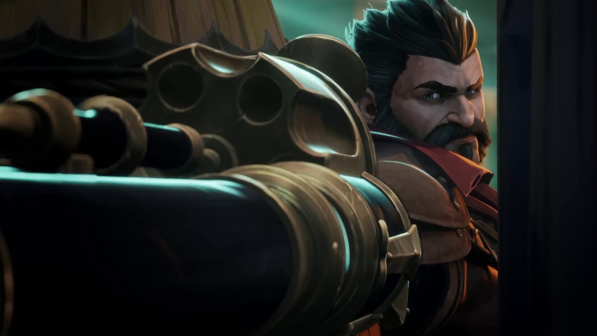 Description: A man with a beard and mustache holding a gun in his hand and looking out of a window at another man with a mustache.