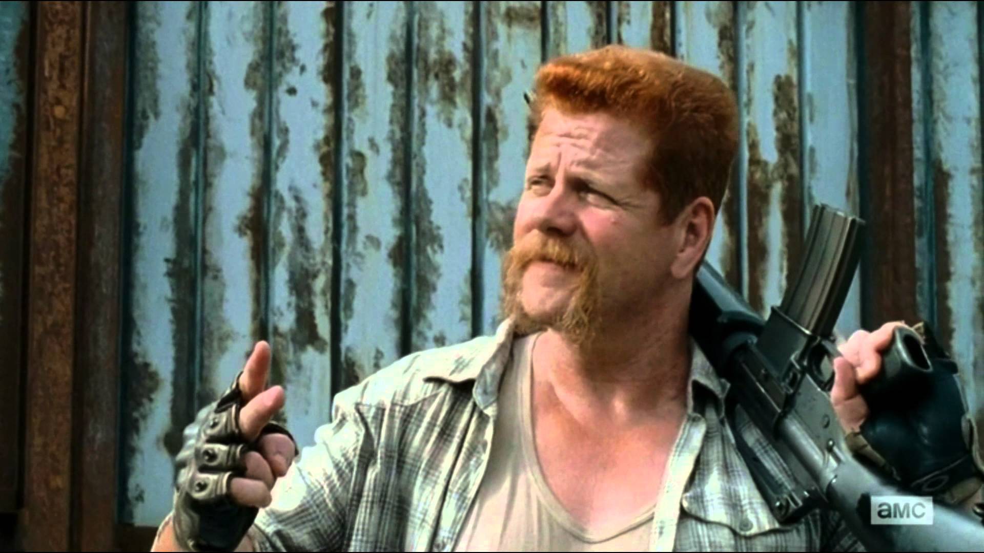 Description: A man with a beard and a beard holding a gun in his hands and wearing a shirt with a pattern.