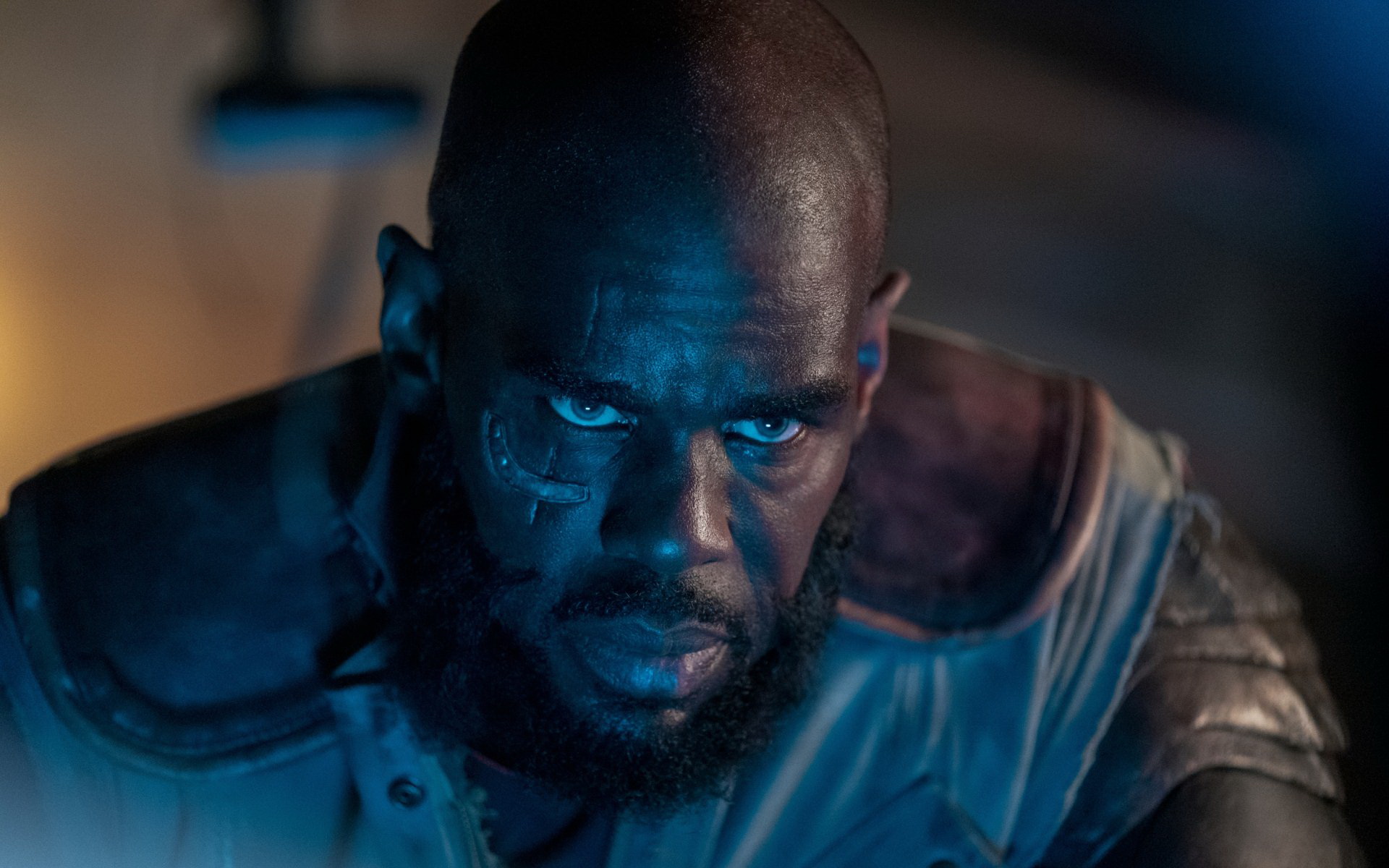 Description: A man with a beard and a leather jacket looks at the camera in a darkened room with a lamp on.