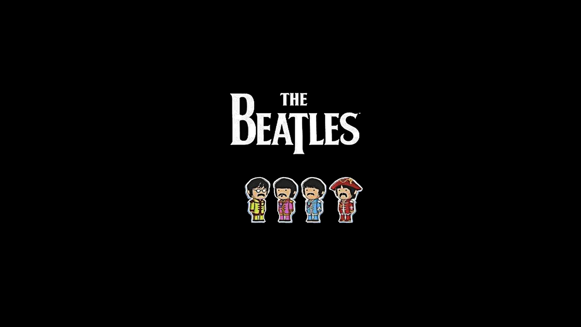Description: The beatles logo on a black background with four people in the middle of it and the beatles logo on the bottom.