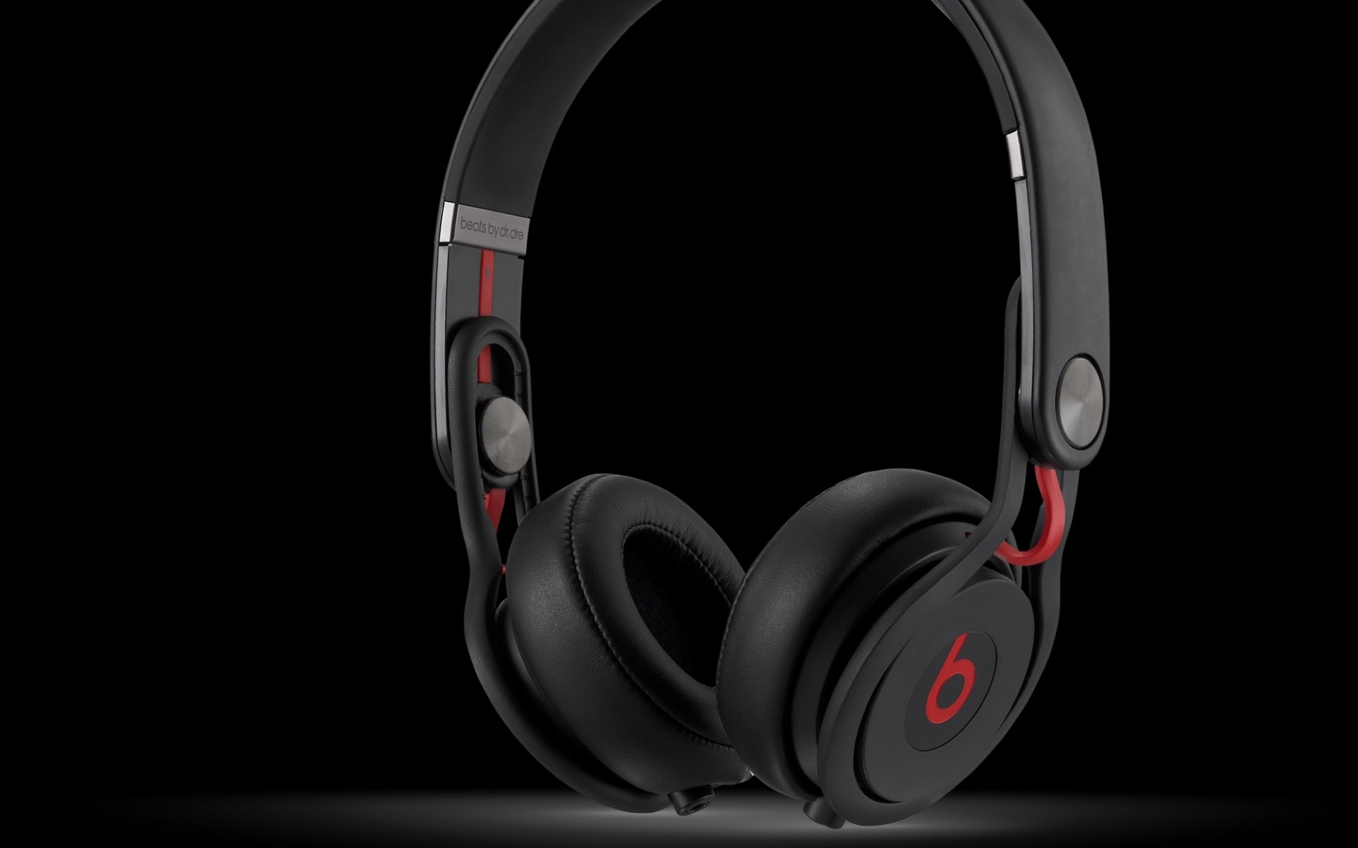Description: A pair of beats by dr dre headphones on a black background with a red stripe around the ear.