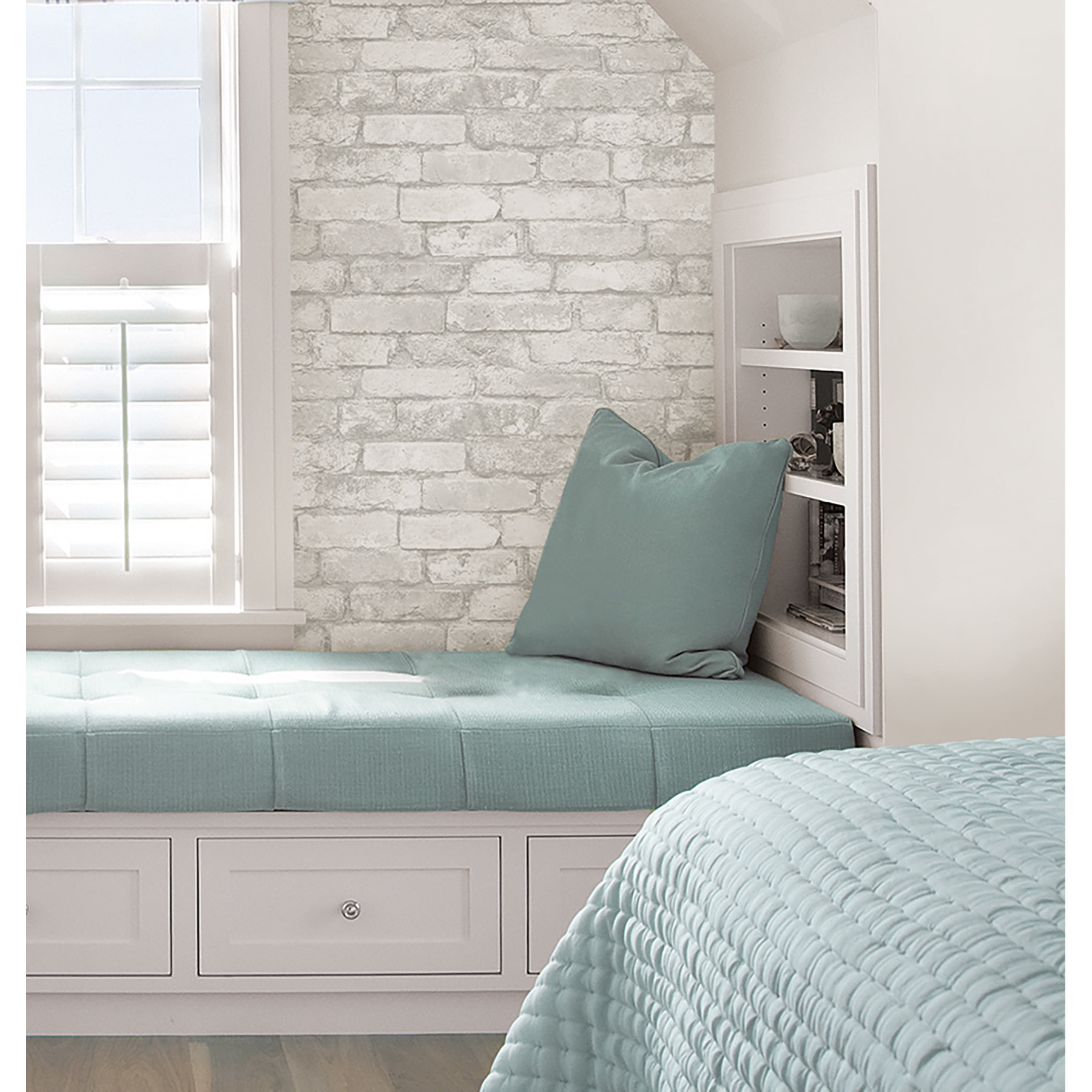 Description: A bed with a blue blanket and pillows in a room with a brick wall and window with shutters.