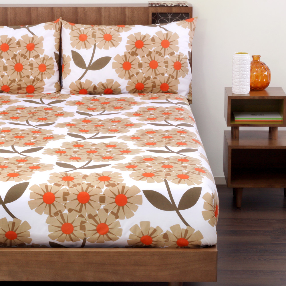 Description: A bed with a flowered comforter and two night stands on a wooden floor next to a nightstand.