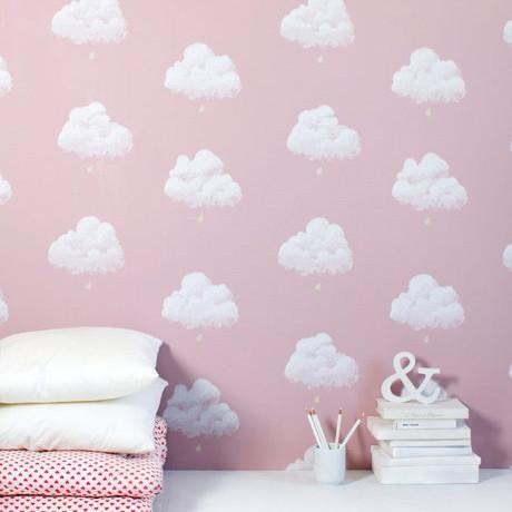 Description: A bed with a pink wall and a white cloud wallpaper on it and a stack of books on the bed.