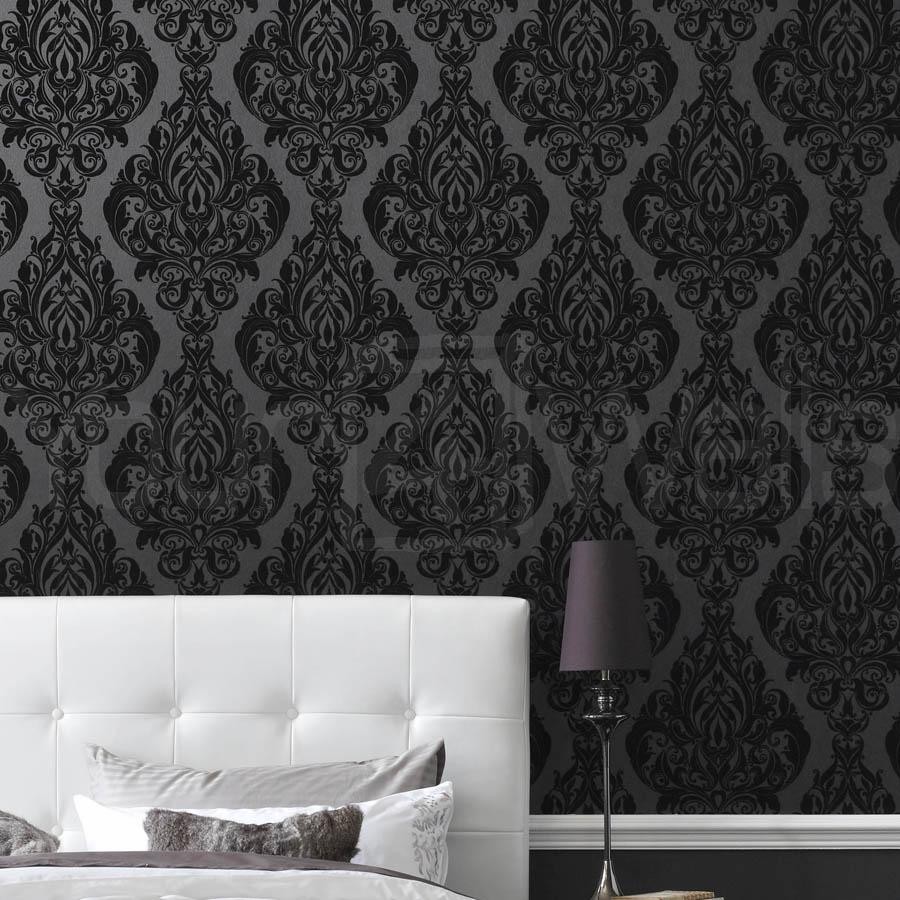 Description: A bed with a white headboard and a black wallpaper behind it and a lamp on a table.