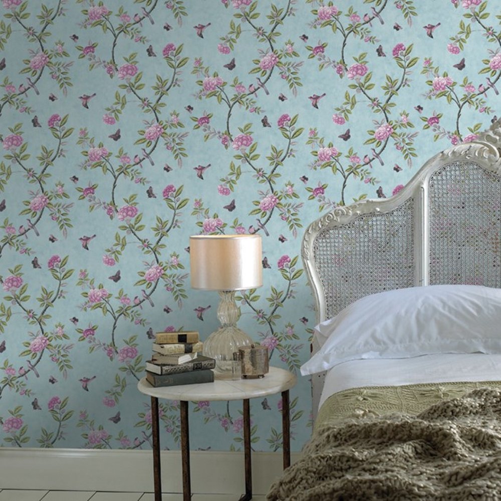 Description: A bed with a white headboard and a white night stand with a lamp on it and a blue wallpaper with pink flowers.