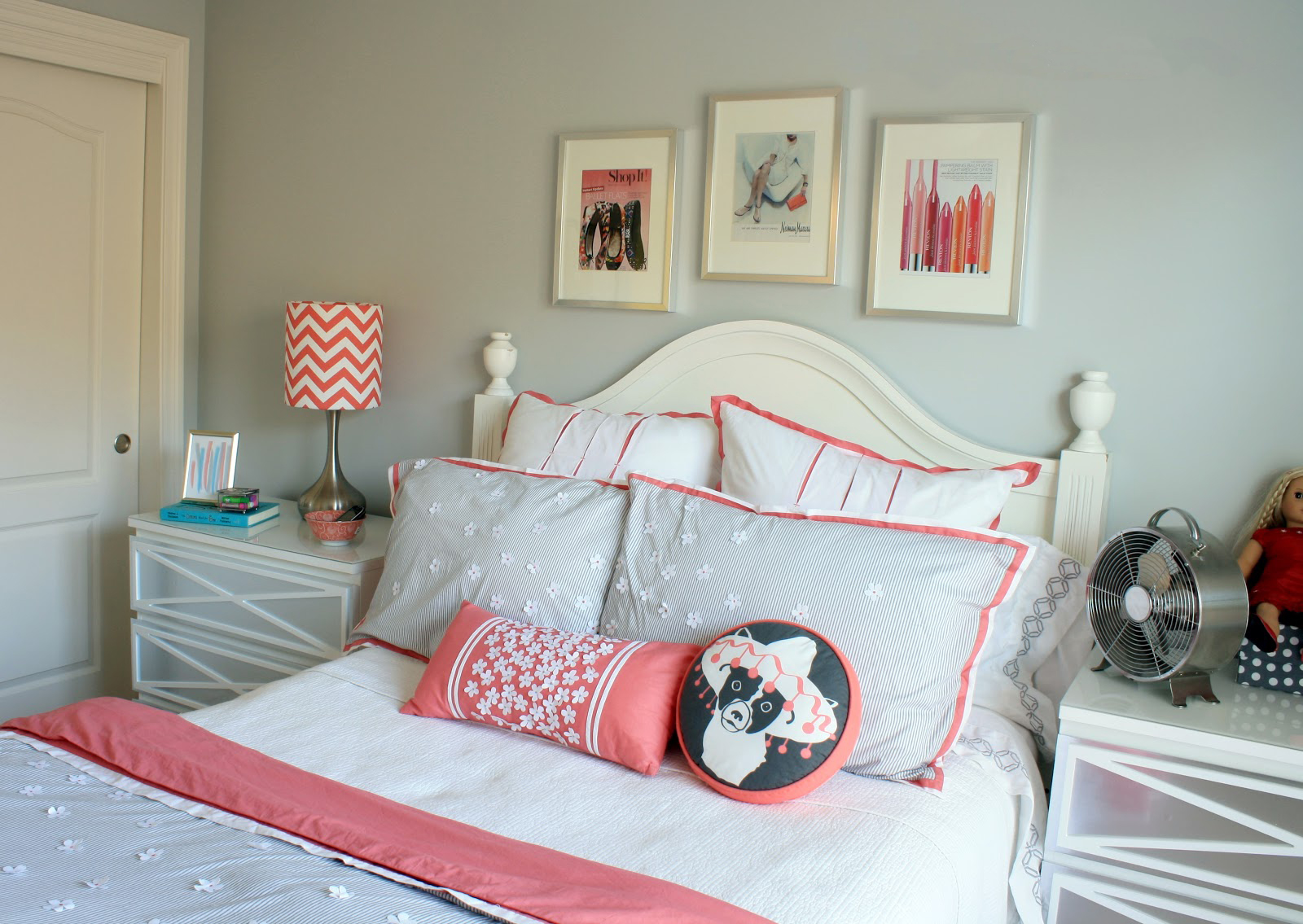 Description: A bed with a white headboard and a pink pillow on it and pictures on the wall above it.