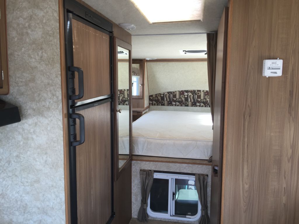 Description: A bedroom with a bed and a refrigerator in a room with a bed and a window in it and a door open.