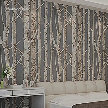 Description: A bedroom with a bed and a wall paper with trees on it and a white dresser with drawers underneath.